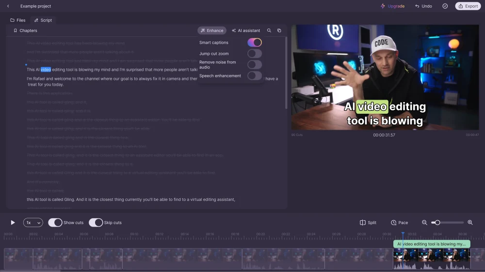 Gling AI est spécialement conçu pour ceux qui créent des vidéos de type “face caméra”. Il automatise des tâches longues et fastidieuses comme la suppression des silences, des erreurs ou des tics de langage. Grâce à lui, les créateurs peuvent se concentrer sur leur contenu sans s’enliser dans l’édition.