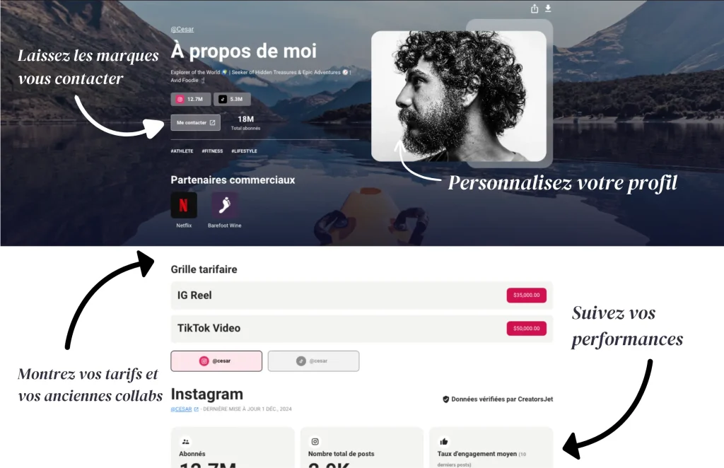 En plus d’offrir un espace de création simplifié et visuellement soigné, CreatorsJet met l’accent sur la mise à jour automatique des statistiques. Résultat : un kit toujours pertinent, sans effort de maintenance. Le partage se fait en un clic via un lien, ce qui facilite la mise en relation avec les marques.
