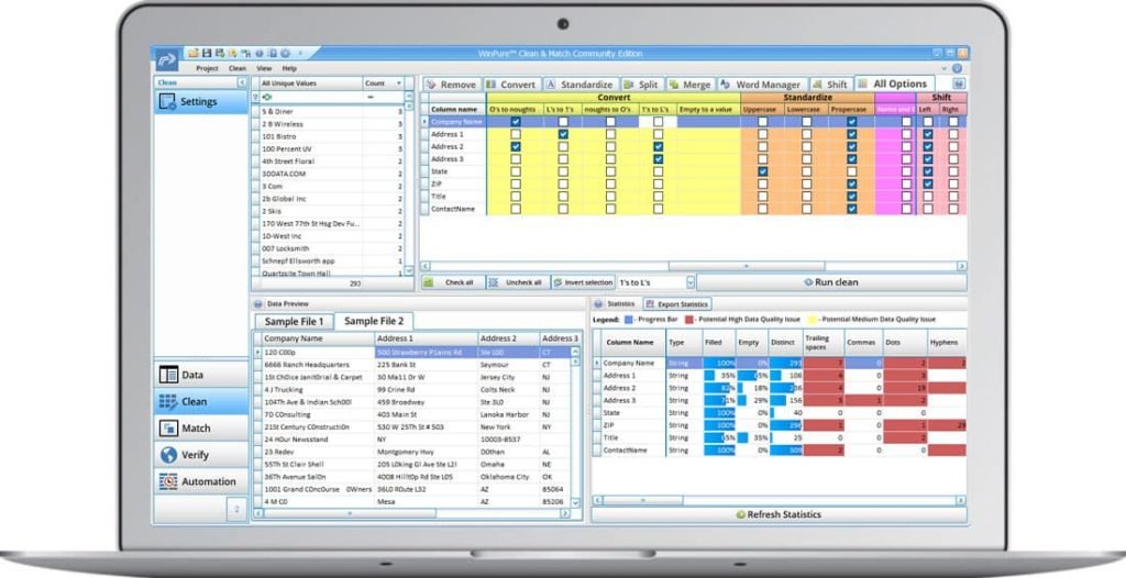 WinPure se distingue par son excellent rapport qualité/prix. Ce logiciel on-premise offre des outils puissants pour dédoublonner, corriger et standardiser des volumes de données très importants. Il est compatible avec divers formats et plateformes, dont les CRM et bases de données SQL.