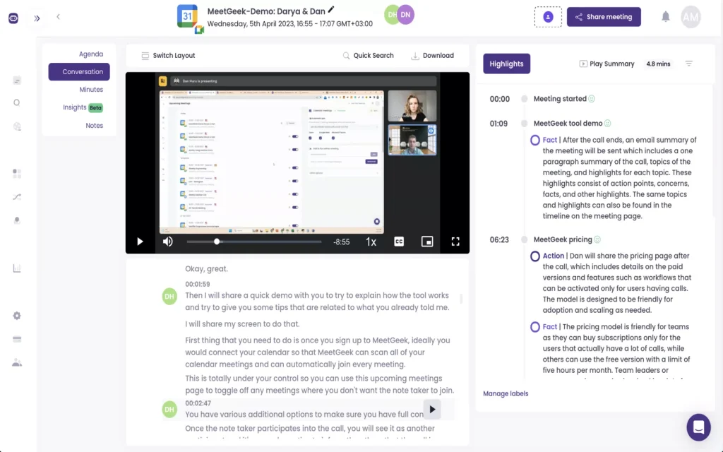 MeetGeek capture, transcrit et synthétise vos réunions sans intervention manuelle. L’outil se connecte à votre calendrier Google pour analyser la gestion de votre emploi du temps, et produit automatiquement des comptes-rendus structurés dans Google Docs. Il extrait les décisions clés, les actions à suivre et propose un résumé clair en quelques lignes.