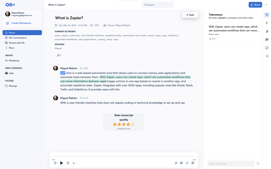 - Organisation intelligente : classez vos transcriptions par mots-clés et étiquettes.