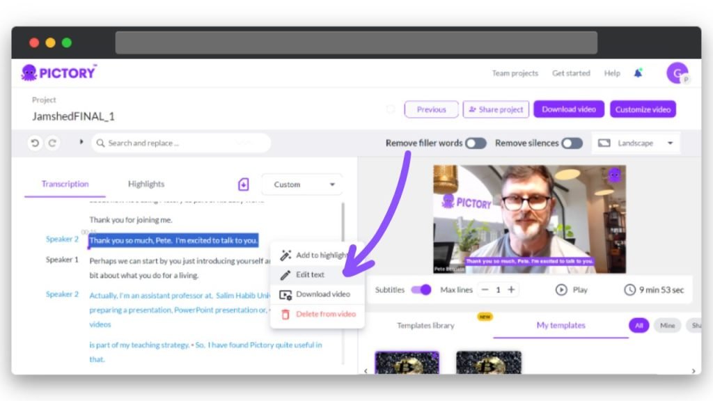 - Édition intuitive via l’interface texte : modifiez facilement vos vidéos comme vous le feriez avec un document texte.