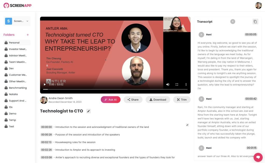 ScreenApp utilise l’IA pour transcrire vos vidéos et audios avec une précision de 99 %. Les transcriptions sont générées à une vitesse éclair, éliminant la nécessité de saisies manuelles fastidieuses.