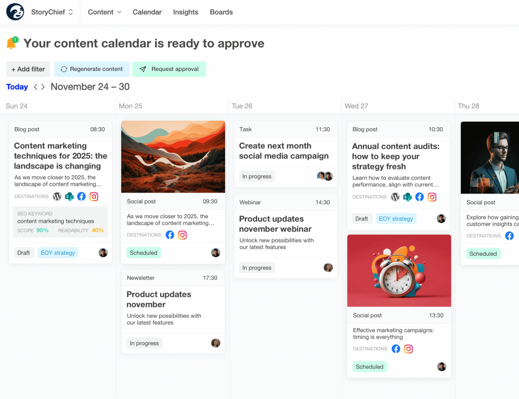 StoryChief est une plateforme de gestion de contenu éditorial alimentée par l’IA, conçue pour centraliser la création, la planification et la publication de contenus sur plus de 100 canaux (réseaux sociaux, CMS, newsletters, etc.). L’outil combine intelligence artificielle, SEO, analyse d’audience et collaboration en équipe pour permettre une gestion stratégique et unifiée de l’écosystème marketing.